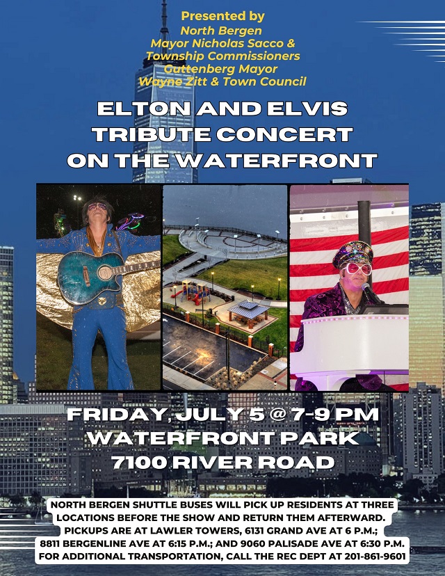North Bergen shuttle buses will pick up residents at three locations prior to the show and bring them back after the concert. Pickups will take place at 6 p.m. at Lawler Towers located at 6131 Grand Avenue, 6:15 p.m. at 8811 Bergenline Avenue, and 6:30 p.m. at 9060 Palisade Avenue. For additional transportation, call the Recreation Department at 201-861-9601.