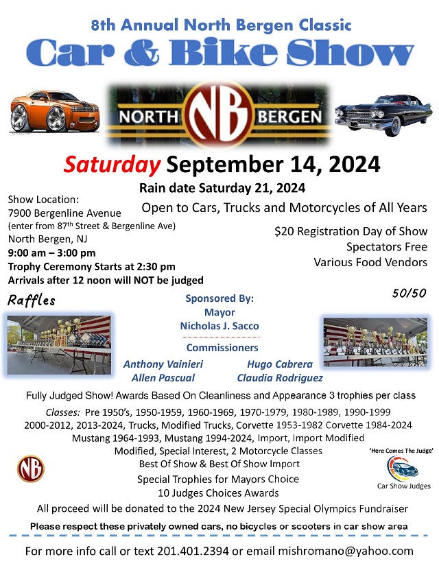 September 06, 2024The Township of North Bergen is hosting its 8th annual Bike & Car Show on Saturday, Sep. 14. The event takes place from 9 a.m. to 3 p.m. beginning at 79th Street and Bergenline and extending north alongside Braddock Park.