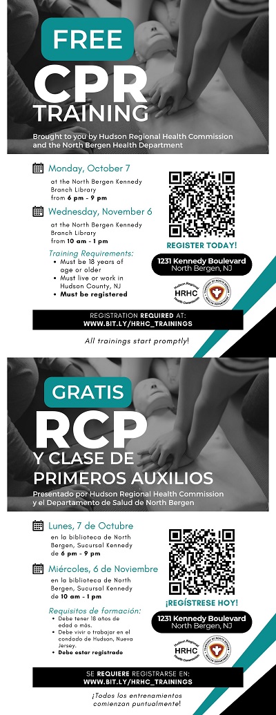 September 10, 2024The North Bergen Health Department is partnering with the Hudson Regional Health Commission to offer free CPR training at the Recreation Center & Library located at 1231 Kennedy Blvd. on the following dates: