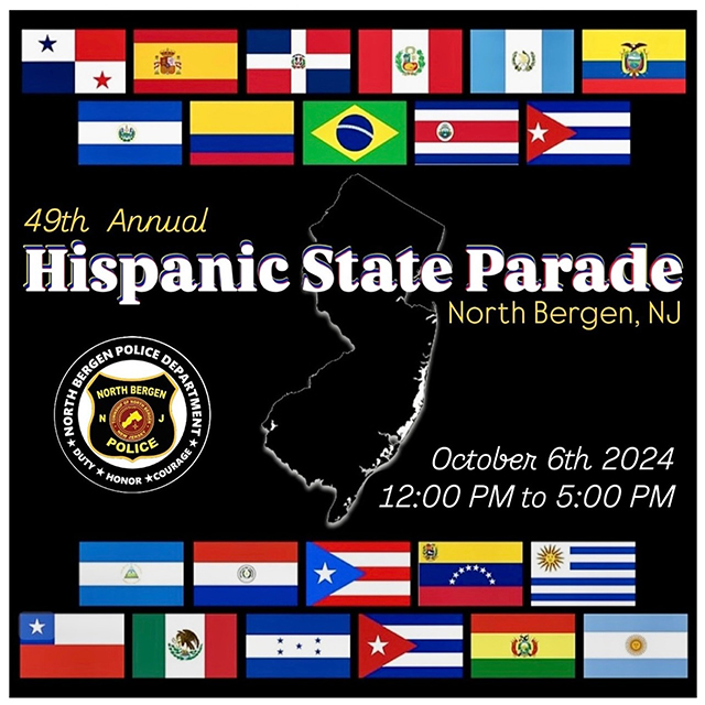 October 04, 2024The 49th annual Hispanic State Parade of New Jersey will take place this Sunday, Oct. 6, 2024. It will start at approximately 1 p.m. at 79th Street and Bergenline Avenue in North Bergen and proceed south to 43rd Street and Bergenline Avenue.