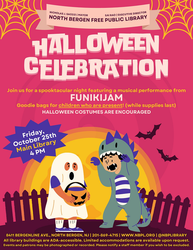October 23, 2024Join the North Bergen Free Public Library for a spooktacular Halloween celebration on Friday, Oct. 25 at 4 p.m. at the main library located at 8411 Bergenline Ave. The event will feature a lively musical performance by FUNIKIJAM and goodie bags for children who attend (while supplies last).