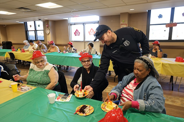 November 22, 2024The Terrace Apartment Building at 6800 Columbia Avenue hosted a “Friendsgiving” event on Monday, Nov. 18 that was highlighted by NBPD officers sharing “Coffee with a Cop.” Police Chief Robert Farley met with residents, along with half a dozen other officers, who helped serve celebratory cake to the many attendees from Terrace and the nearby Meadow Hill Apartments.