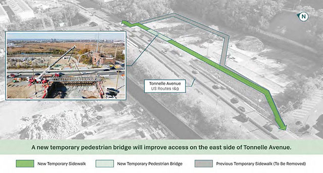 November 25, 2024The Gateway Development Commission has announced that effective Wednesday, Nov. 27, 2024 pedestrian access along the east side of Tonnelle Avenue (northbound) will be changed to accommodate the next phase of construction. The new temporary route will include a pedestrian bridge adjacent to Tonnelle Avenue. Pedestrians should follow the signs and stay within the marked walkway at all times.