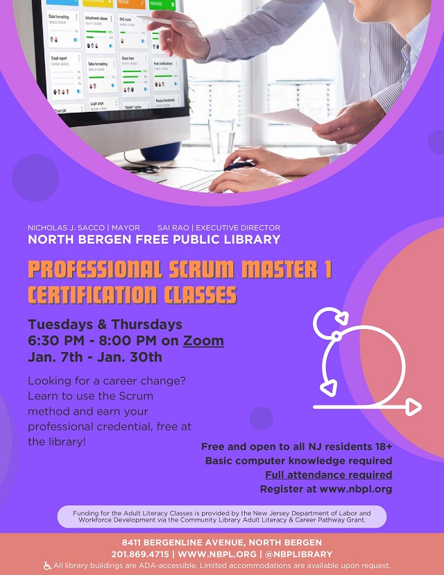 December 26, 2024Join the North Bergen Free Public Library for a free Professional Scrum Master 1 certification course. This course is open to New Jersey residents ages 18 and older with basic computer knowledge.