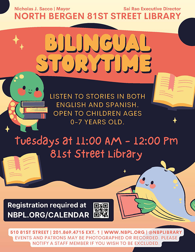 February 21, 2025Join the North Bergen 81st Street Library for bilingual storytime where children can enjoy stories in both English and Spanish. This program is open to children ages 0-7 and offers a fun and engaging way to explore storytime and literacy.