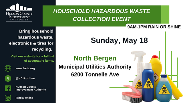 May 16, 2025Local residents are invited to properly discard old electronics, tires, and household hazardous waste at the Hudson County Improvement Authority’s upcoming Spring Household Waste Collection Day on Sunday, May 18, 2025.