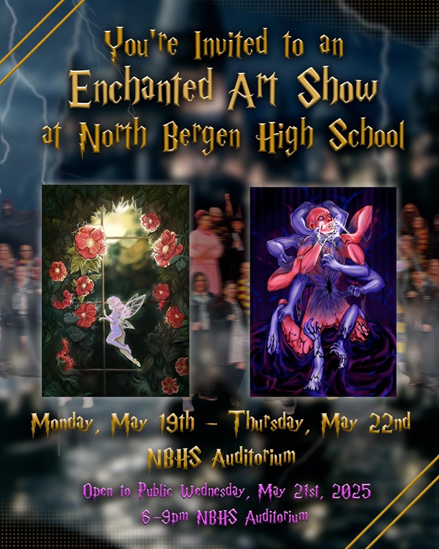 May 16, 2025North Bergen High School is hosting an “Enchanted Art Show” in the school auditorium. The public is invited to come explore the magical creations of NBHS’ multi-talented student artists from 6 to 9 p.m. on Wednesday, May 21.