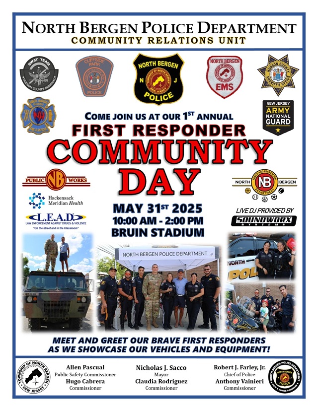 May 28, 2025The North Bergen Police Department’s Community Relations Unit is sponsoring its inaugural “First Responders Community Day” on Saturday, May 31 from 10 a.m. to 2 p.m. at Bruin Stadium.