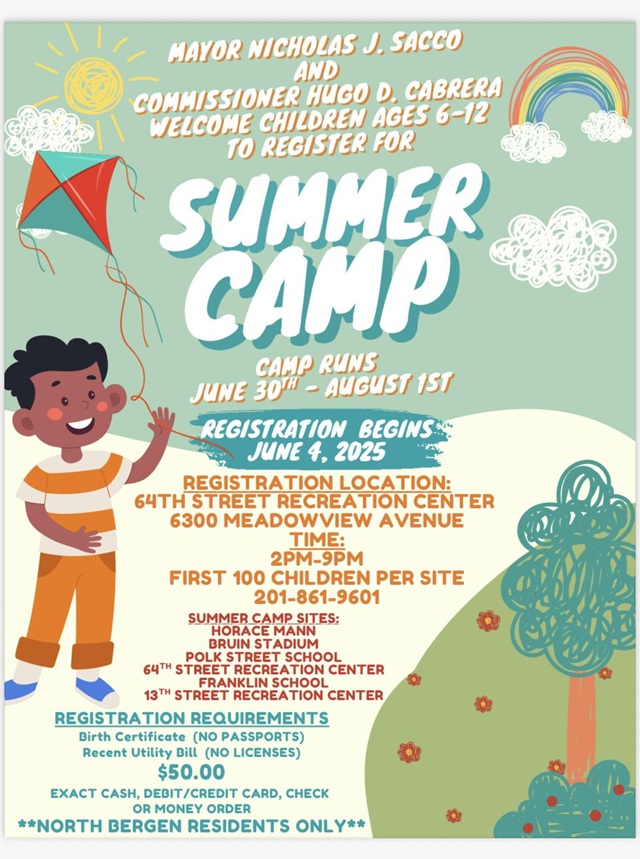 May 30, 2025Mayor Nicholas Sacco and Commissioner Hugo Cabrera welcome children ages 6-12 to register for summer camp. The camp will run from Jun. 30 to Aug. 1, 9 a.m. to 3 p.m. at the following sites: