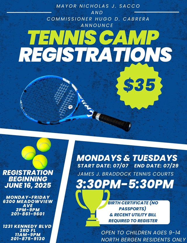 June 13, 2025Mayor Nicholas J. Sacco and Commissioner Hugo D. Cabrera invite North Bergen children ages 9 to 14 to register for this year’s Tennis Camp. Registration begins Monday, Jun. 16 and the fee is $35. To register, parents must bring a birth certificate (no passports) and a recent utility bill (no licenses or IDs).
