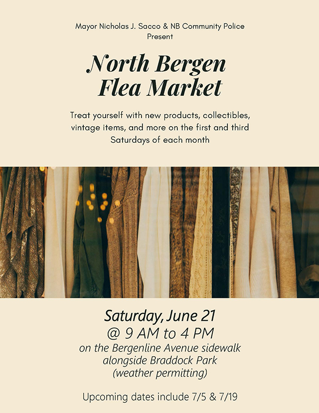 June 18, 2025The North Bergen Flea Market & Collectible Fair will return to Bergenline Avenue on Saturday, Jun. 21, 2025 from 9 a.m. to 4 p.m. on the sidewalk stretching south from 90th Street alongside Braddock Park (weather permitting).