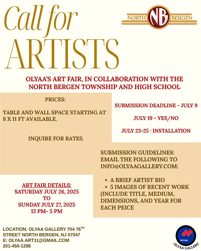 July 03, 2025North Bergen Township, in collaboration with OLYAA Gallery is inviting local artists to take part in a community art fair on Saturday, July 26 and Sunday, July 27, 2025 from 12 to 5 p.m. at OLYAA Gallery, 704 76th Street.