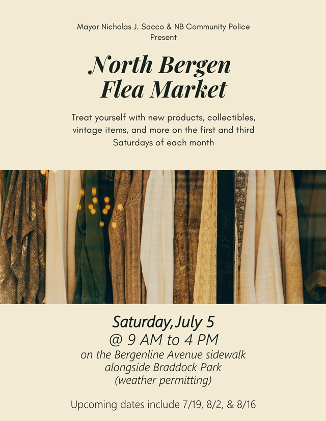 July 02, 2025The North Bergen Flea Market & Collectible Fair will return to Bergenline Avenue on Saturday, Jul. 5 from 9 a.m. to 4 p.m. on the sidewalk stretching south from 90th Street alongside Braddock Park (weather permitting).