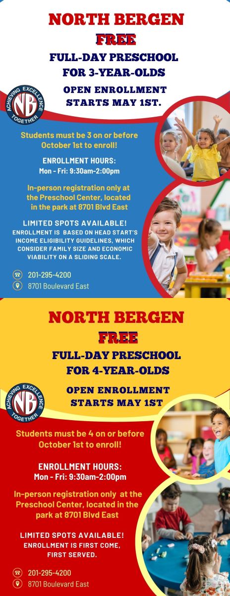 July 11, 2025Registration is open now for North Bergen’s new free full-day pre-K 3 and pre-K 4 programs. Registration must be done in-person between 9:30 a.m. and 2 p.m. Monday through Friday at the North Bergen Pre-K Center, 8701 Boulevard East within Braddock Park. Slots are limited and will be offered on a first-come, first-served basis.