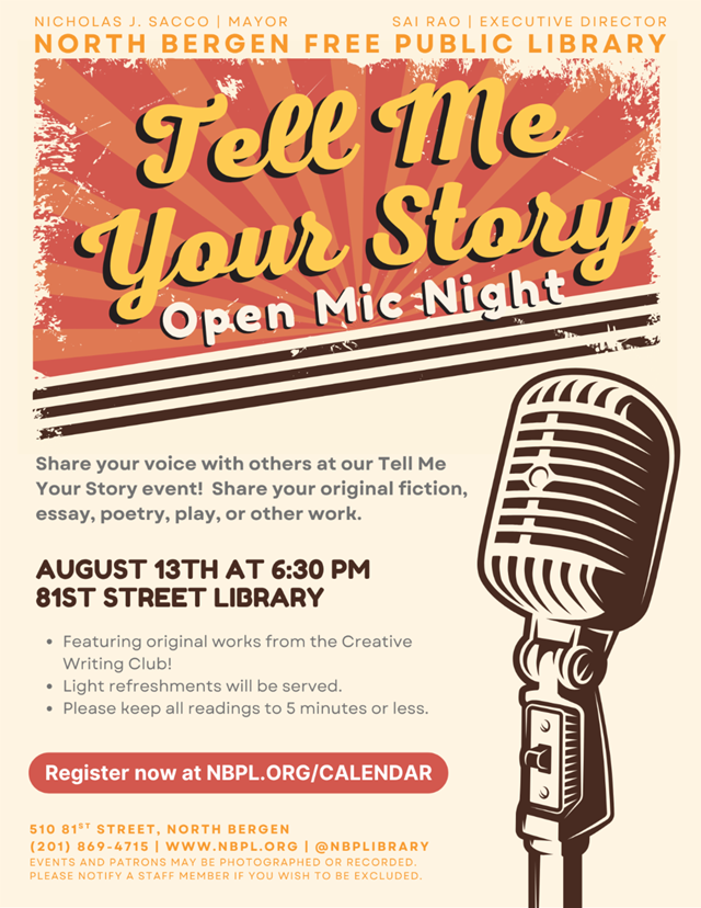August 12, 2025Visit the North Bergen Free Public Library’s 81st Street Branch on Wednesday, Aug. 13 for a “Tell Me Your Story” open mic night. This week they are featuring original works from the Creative Writing Club.