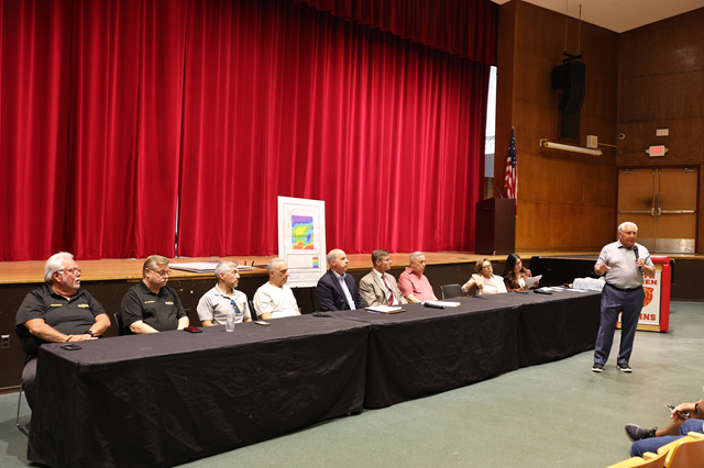 August 15, 2025Mayor Nicholas Sacco and members of the Department of Public Works met with residents on Tuesday, Aug. 12 to discuss upgrades to sewer and water lines. Commissioners Anthony Vainieri and Claudia Rodriguez were among the Township representatives who joined the mayor at the meeting in the North Bergen High School auditorium, along with DPW Superintendent John Shaw, Township Administrator Janet Castro, Fire Director Michael DeOrio, and others.