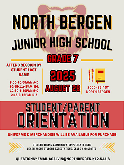 August 22, 2025The North Bergen School District has announced grade 7 and grade 8 orientation dates for students entering the new junior high school at 2000 85th Street.