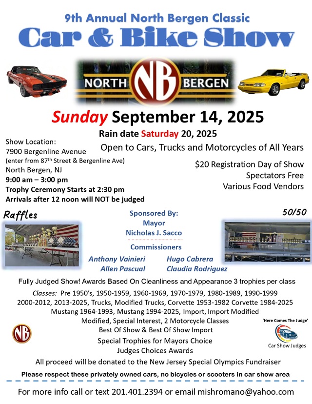 August 22, 2025Mark your calendars! The Township of North Bergen’s ninth annual Classic Car & Bike Show will take place on Sunday, Sep. 14 from 9 a.m. to 3 p.m. beginning at 79th Street and Bergenline and extending north alongside Braddock Park.