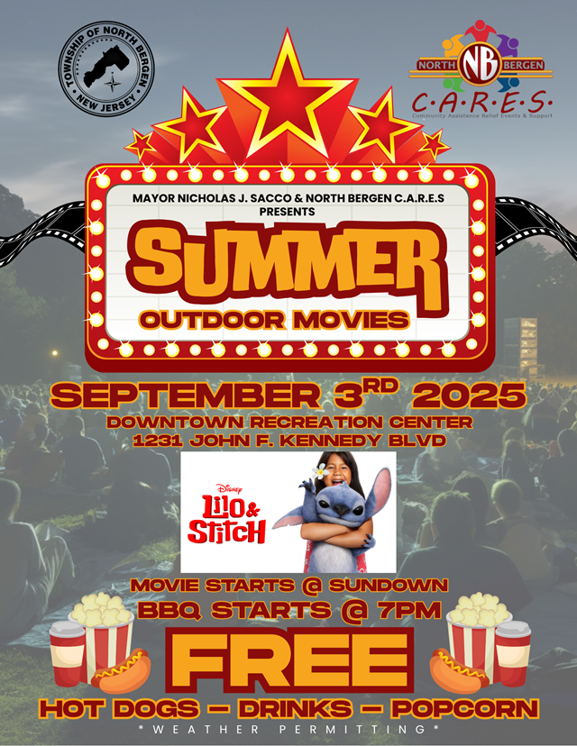 September 02, 2025North Bergen’s Summer Outdoor Movie Series continues this Wednesday, Sep. 3 with a screening of “Lilo & Stitch” at the North Bergen Recreation Center & Library located at 1231 Kennedy Blvd.