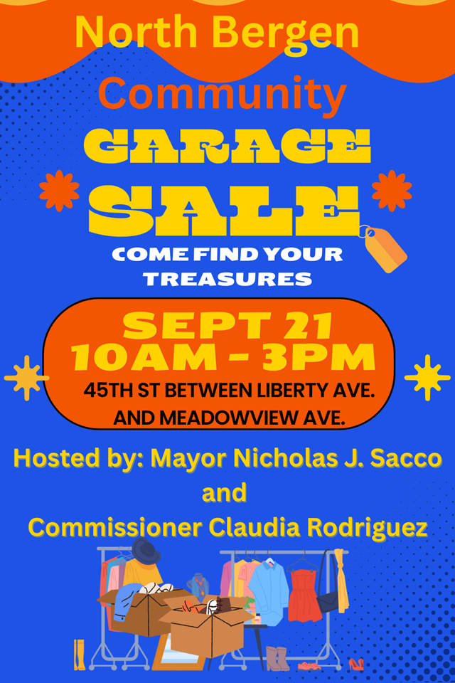 September 15, 2025Mayor Nicholas Sacco and Commissioner Claudia Rodriguez invite everyone to come shop for treasures at the community garage sale from 10 a.m. to 3 p.m. on Sunday, Sep. 21 at the North Bergen Nutrition Center, 1441 45th Street.