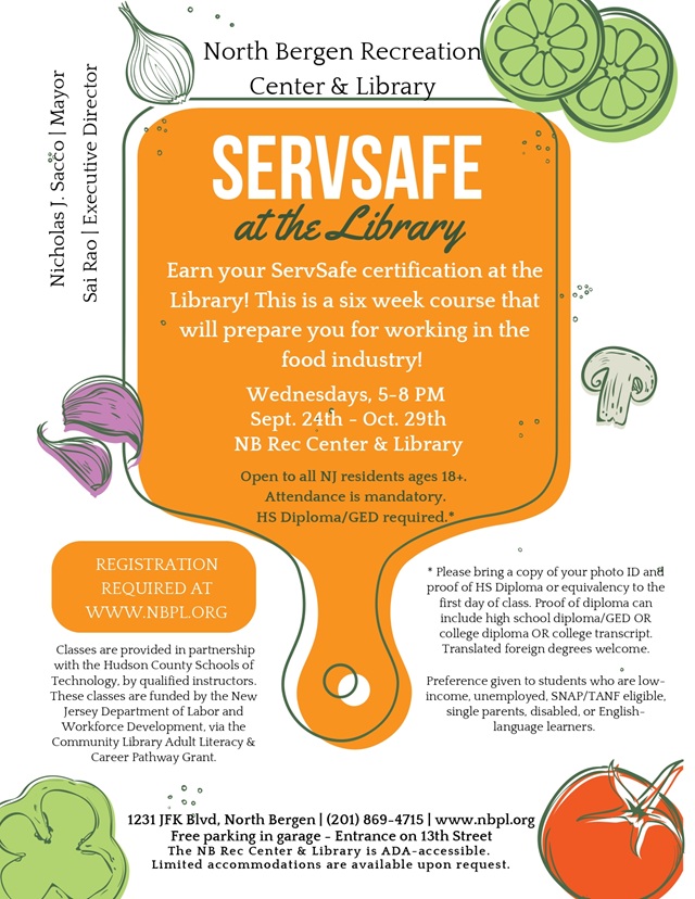 September 17, 2025The North Bergen Recreation Center & Library is offering a six-week course to prepare participants for working in the food industry. The course takes place from 5 to 8 p.m. on Wednesdays between Sep. 24 and Oct. 29.