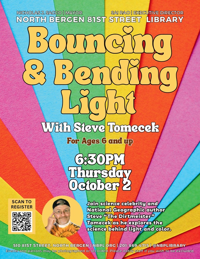 September 30, 2025Join the North Bergen Free Public Library for a fun and educational science program with Steve “The Dirtmeister” Tomecek, National Geographic author and science personality, as he demonstrates how light and color work in the world around us.