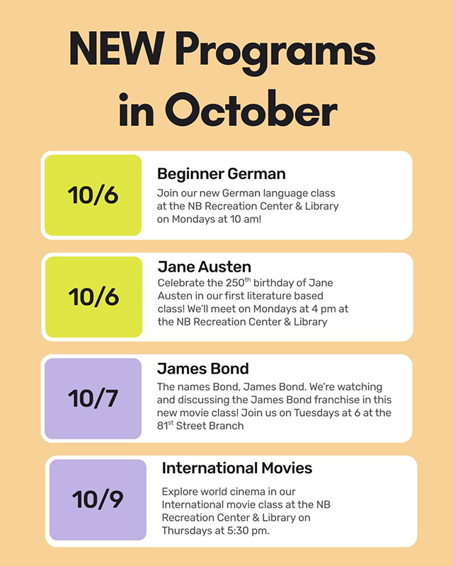 - Jane Austen – NB Rec Center & Library starting Oct. 6 @ 4 p.m.