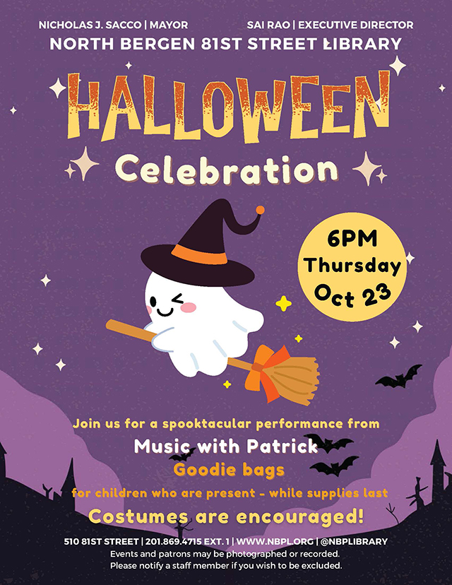 October 21, 2025The North Bergen Free Public Library invites kids and families to a Halloween celebration at 6 p.m. on Thursday, Oct. 23, 2025 at the 81st Street Library located at 510 81st St.
