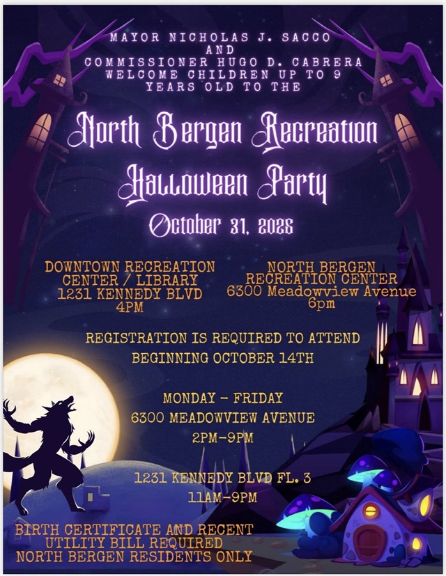 October 29, 2025The North Bergen Recreation Department invites residents up to nine years old to two Halloween parties on Friday, Oct. 31. Registration is required in advance and is open Monday through Friday at the following locations: