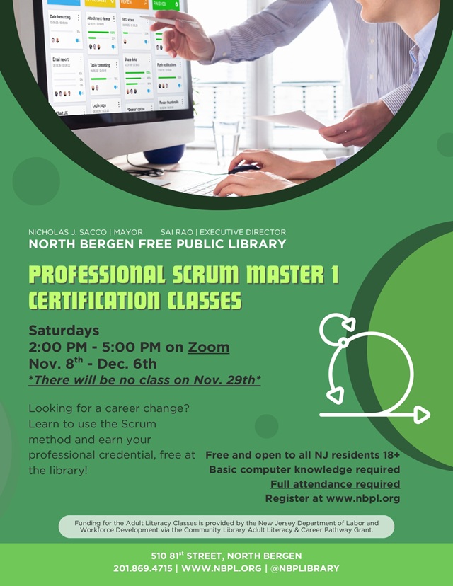 October 31, 2025Join the North Bergen Free Public Library for a free Professional Scrum Master 1 certification course. This course is open to New Jersey residents ages 18 and older with basic computer knowledge.