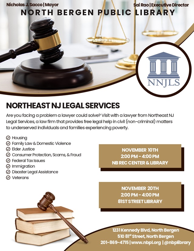 Northeast NJ Legal Services offers free support for various civil matters including housing, immigration, federal tax issues, housing, family law, domestic violence, elder justice, consumer protection, scams, fraud, veterans and disaster legal assistance.