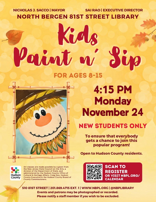 November 21, 2025The North Bergen Free Public Library invites children ages 8 to 15 to a kids’ Paint & Sip program at 4:15 p.m. on Monday, Nov. 24 at the 81st Street Library, located at 510 81st Street.