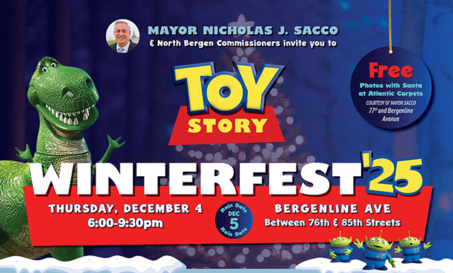 December 01, 2025Mayor Nicholas Sacco and the North Bergen Board of Commissioners invite everyone to join them at the Toy Story Winterfest on Thursday, Dec. 4, 2025 from 6 to 9:30 p.m. along Bergenline Avenue between 76th and 85th Streets. The evening includes free photos with Santa at Atlantic Carpets, located at 77th and Bergenline Avenue, courtesy of Mayor Sacco.