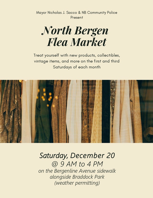 December 18, 2025The North Bergen Flea Market & Collectible Fair will return to Bergenline Avenue on Saturday, Dec. 20 from 9 a.m. to 4 p.m. on the sidewalk stretching south from 90th Street alongside Braddock Park (weather permitting).