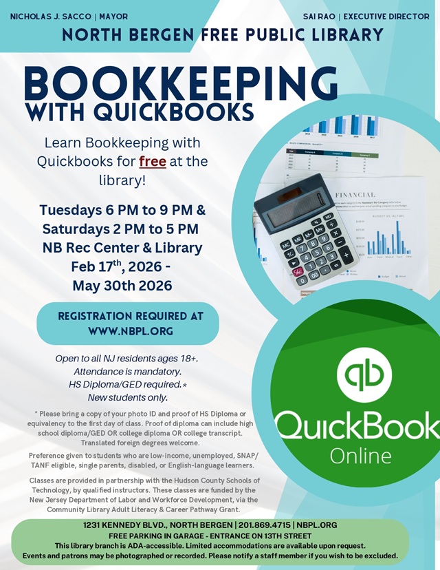 January 16, 2026The North Bergen Free Public Library is offering classes to learn bookkeeping with QuickBooks for free. Master the fundamentals and improve your bookkeeping skills every Tuesday from 6 to 9 p.m. and Saturdays from 2 to 5 p.m., from Feb. 17 through May 30. Classes will be held at the North Bergen Recreation Center & Library, located at 1231 Kennedy Blvd.