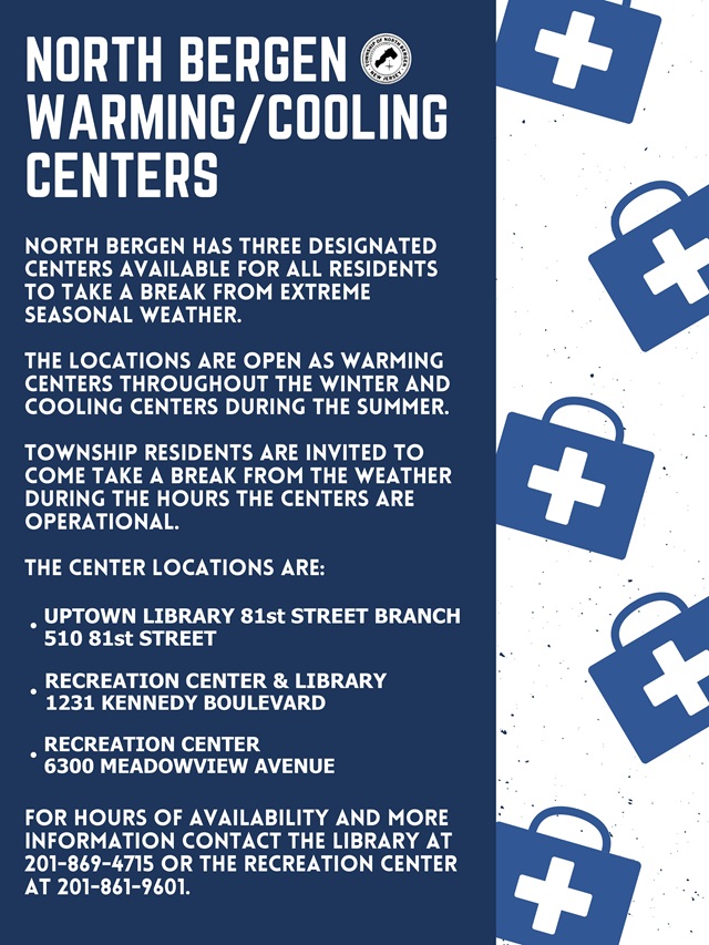 February 06, 2026During cold weather, North Bergen’s three designated warming centers are available to provide relief. Township residents who are feeling the chill are invited to come warm up during the hours the centers are operational. The warming center locations are: