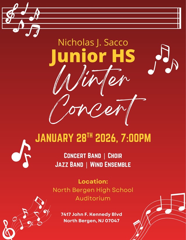 January 26, 2026The Nicholas J. Sacco Junior High School is presenting their first winter concert on Wednesday, Jan. 28. The event takes place at 7 p.m. in the North Bergen High School auditorium at 7417 Kennedy Boulevard.