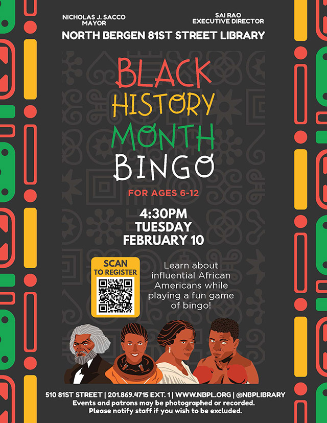 The North Bergen Free Public Library invites kids ages 6 to 12 to learn about influential African Americans in history while playing a fun game of bingo at the 81st St Library on Tuesday, Feb. 10, 2026 at 4:30 p.m. Registration is required at NBPL.org/calendar.