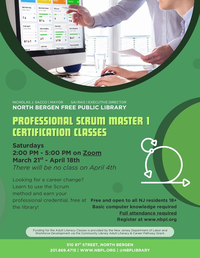 March 19, 2026Join the North Bergen Free Public Library for a free Professional Scrum Master 1 certification course. This course is open to New Jersey residents ages 18 and older with basic computer knowledge.