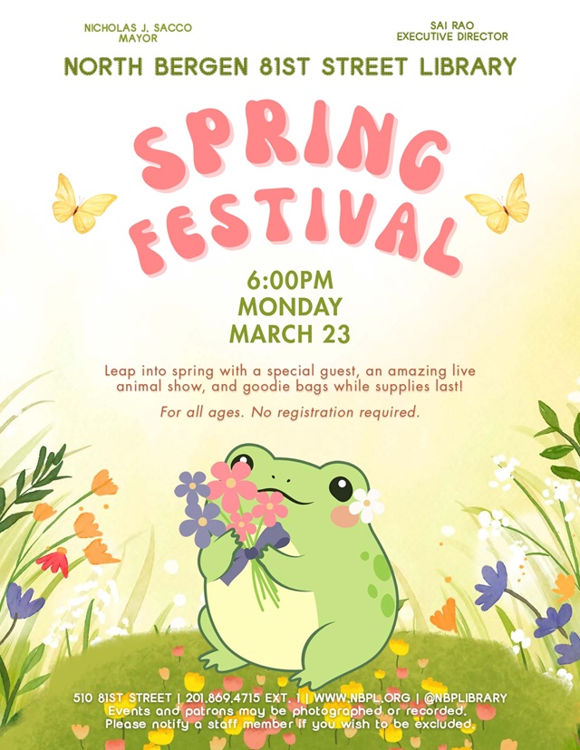 March 20, 2026Friday, Mar. 20 is the first day of spring! The North Bergen Free Public Library invites residents to attend a spring festival at 6 p.m. on Monday, Mar. 23 at the 81st Street Library, located at 510 81st Street. The event will feature a special guest, a live animal show, and goodie bags while supplies last.