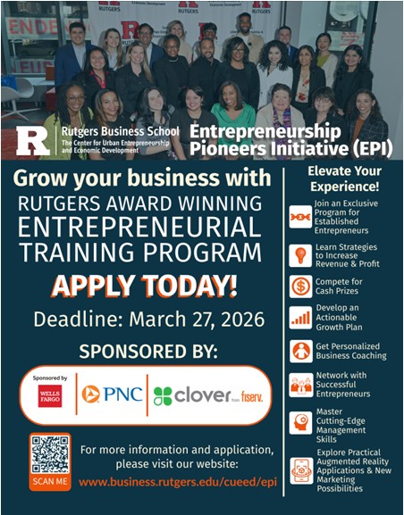 March 25, 2026Rutgers Business School’s Center for Urban Entrepreneurship & Economic Development is accepting applications for the Entrepreneurship Pioneers Initiative (EPI), an award-winning entrepreneurial training program designed to help established entrepreneurs grow their businesses. The application deadline is Friday, Mar. 27.
