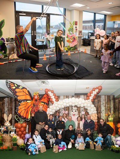Meanwhile, kids enjoyed free face-painting, balloon creations, bounce houses, a petting zoo with bunnies and chicks, live DJs, photo booth, giant robots, singing and dancing with Disney characters, and much more. A bubble show uptown allowed kids to actually climb inside huge bubbles, while mothers were treated to free flowers. Everyone took home stuffed gift baskets, chocolate bunnies and candy, and other treats.