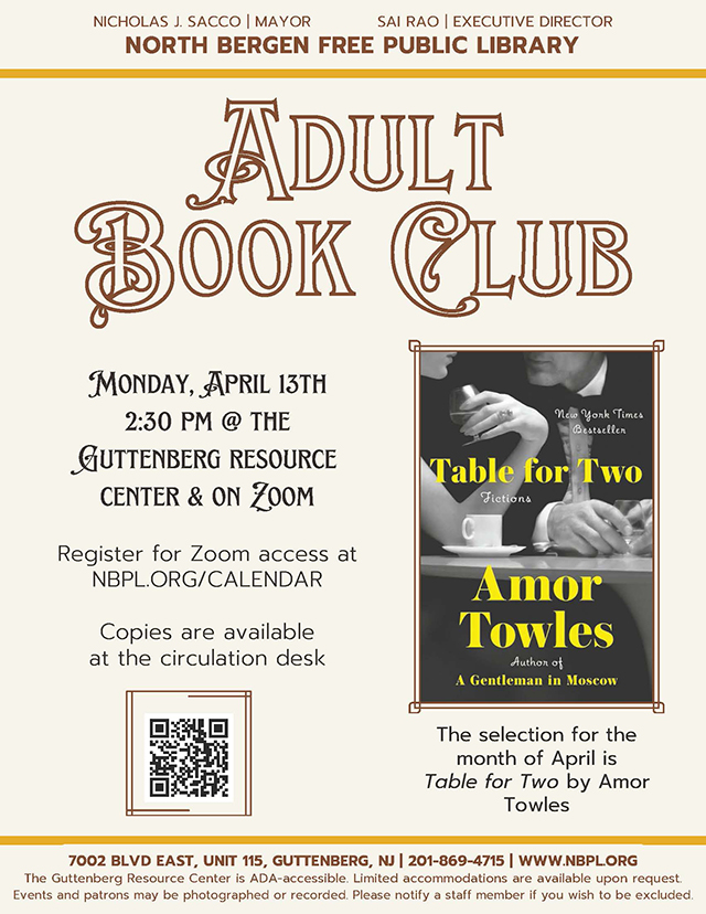 April 10, 2026Residents are invited to join the North Bergen Free Public Library’s Adult Book Club. This month’s selection is “Table for Two,” by Amor Towles.