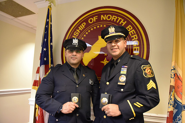 November 08, 2019Mayor Nicholas Sacco presided over the promotion of two police officers to supervisory ranks at a ceremony in North Bergen town hall on Wednesday, Nov. 6, 2019. At the event Officer Alfredo Echeverria was promoted to sergeant and Roberto Ruiz was promoted to lieutenant.