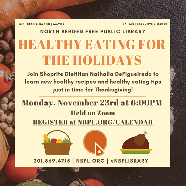 November 19, 2020Join ShopRite dietitian Nathalia DeFigueiredo to learn new healthy recipes and healthy eating tips just in time for Thanksgiving at the North Bergen Free Public Library’s new session, “Healthy Eating for the Holidays.”