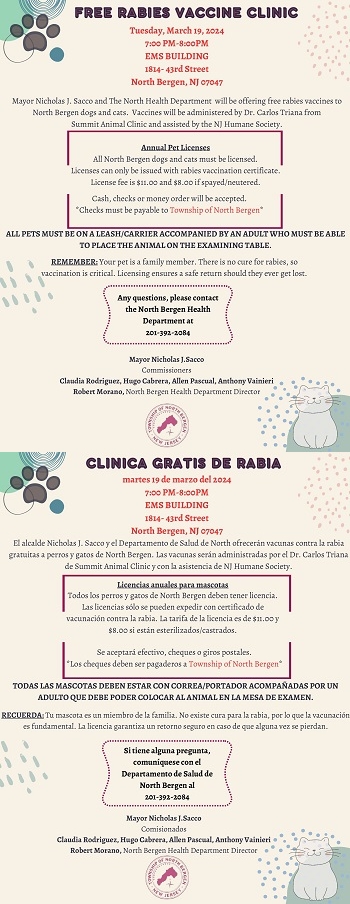 March 06, 2024Mayor Nicholas Sacco and The North Bergen Health Department will be offering free rabies vaccines to North Bergen dogs and cats. Vaccines will be administered by Dr. Carlos Triana from Summit Annual Clinic and assisted by the NJ Humane Society.