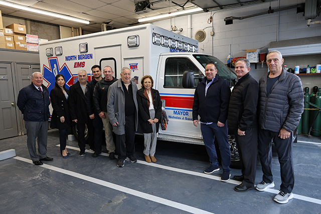 Mayor Nicholas Sacco visited the EMS station house on Wednesday, Mar. 6 to view the new ambulances, joined by Commissioners Hugo Cabrera, Allen Pascual, Claudia Rodriguez, and Anthony Vainieri, along with Township Administrator Janet Castro, EMS Chief David Prina, County Commissioner Robert Baselice, NHRFR Executive Director Michael DeOrio, and numerous police and EMS personnel.