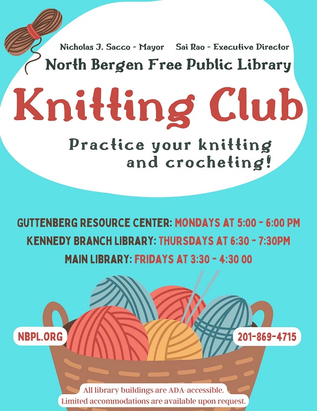 April 26, 2024The North Bergen Free Public Library is hosting a knitting club at all three locations, where enthusiasts can practice knitting and crocheting. Whether individuals are seasoned knitters or beginners, all are welcome to join in the fun.
