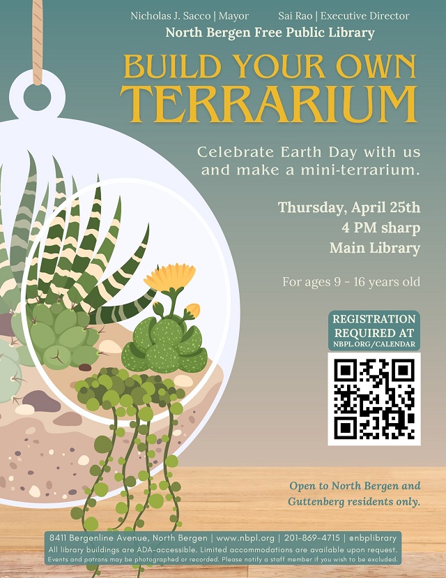 April 23, 2024The North Bergen Free Public Library is inviting participants aged 9 through 16 to celebrate Earth Day by building their own mini-terrarium on Thursday, Apr. 25 at 4 p.m. Terrariums are miniature gardens housed inside small, sealable glass containers. The event will take place at the main library located at 8411 Bergenline Ave. Open to North Bergen and Guttenberg residents only.